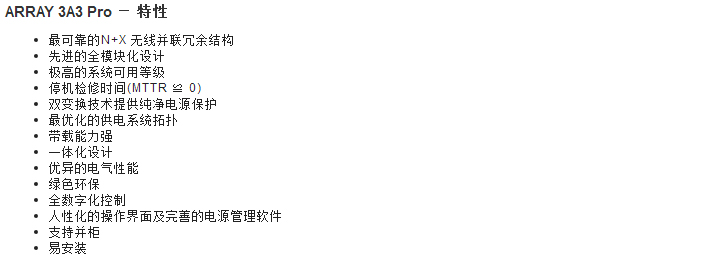 ARRAY 3A3 Pro 是Eaton 新一代模塊化UPS,為數據中心機房提供安全、可靠、穩定、環保的不間斷電源,與Eaton 的PPM 精密配電柜和ARRAY系列服務器機柜的完美組合,為客戶提供一體化、一站式的基礎電源解決方案。