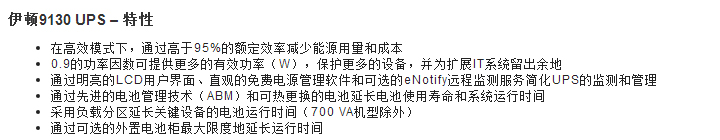 伊頓9130 UPS可為服務器、語音和數據網絡、存儲系統和其它IT設備提供在線電源質量和可升級的運行時間。通過高于95%的額定效率削減能源成本,9130 UPS通過先進的電池管理技術(ABM)大大延長了電池使用壽命。9130 UPS還有一個明亮的LCD用戶界面,可簡化監測。
